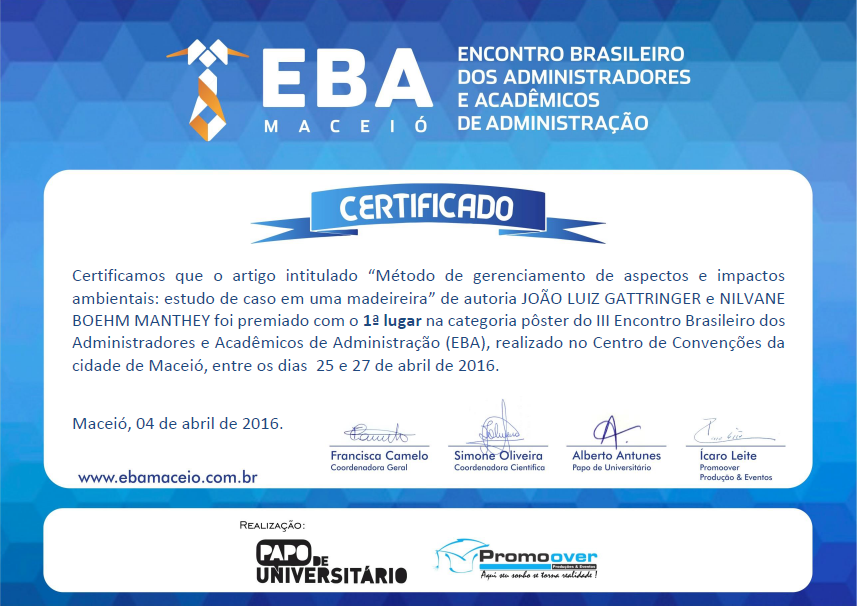 “Método de gerenciamento de aspectos e impactos ambientais: estudo de caso em uma madeireira”, é o título do artigo científico do auditor fiscal de controle externo do Tribunal de Contas de Santa Catarina João Luiz Gattringer, mestre em Administração na Universidade do Vale do Itajaí (Univali), premiado no Encontro Brasileiro dos Administradores e Acadêmicos de Administração – EBA 2016. O trabalho foi feito em coautoria com o professor Alexandre de Ávila Lerípio, do Programa de Pós-Graduação em Administração da Univali e a mestre Nilvane Boehm Manthey. O evento ocorreu de 25 a 27 de março, em Maceió (Alagoas).